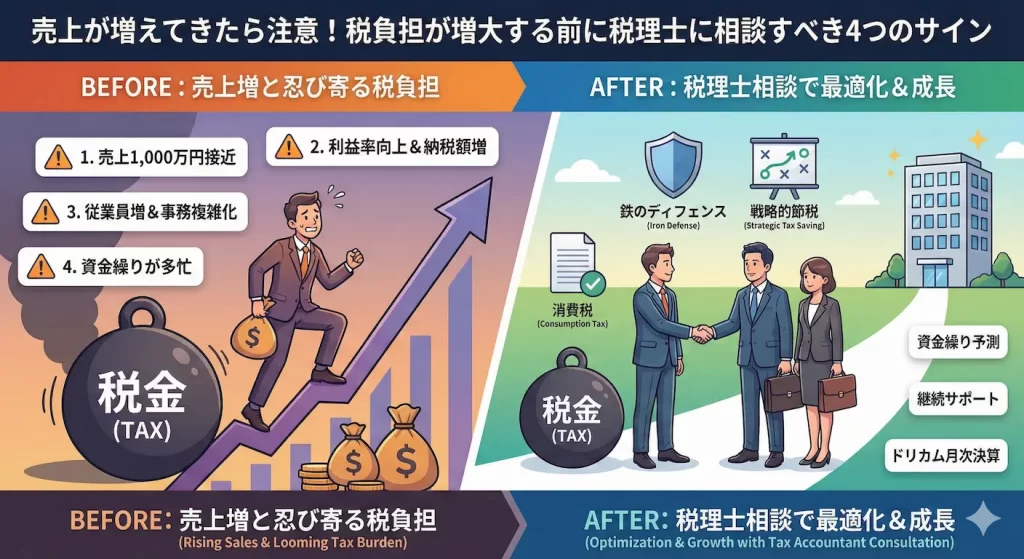 コラム2025年12月25日売上が増えてきたら注意!税負担が増大する前に税理士に相談すべき4つのサイン