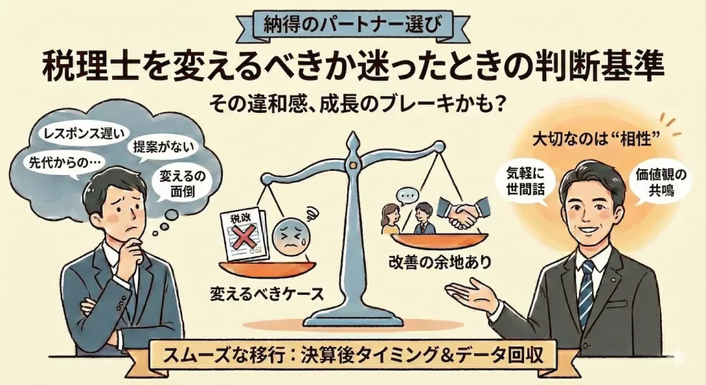 この記事では、税理士の変更を迷ったときにチェックすべき判断基準と、スムーズな乗り換えのための注意点を詳しく解説します。