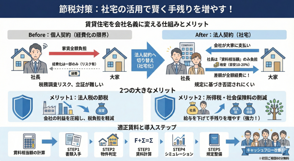 - シミュレーション例: 例えば、月20万円の家賃を社宅化し、役員報酬を調整した場合に、年間でいくら手残りが増えるかを具体的な数値で示します。