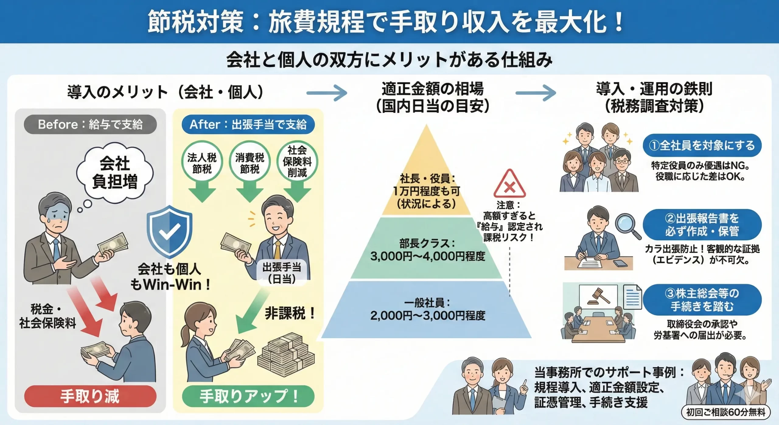 単なる社内ルールの整備だと思われがちですが、実は「手取り収入」に直結する税金節約効果の高い対策となります。